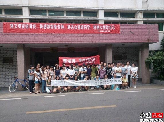 仔细一问才知道,这些同学是来自武汉生物工程学院2012级生物工程专业6班的同学们,他们今早的活动,是为了告诉大家他们十分敬爱自己的班主任曹晓玲老师,他们记得曹老师与自己相处的每时每刻。