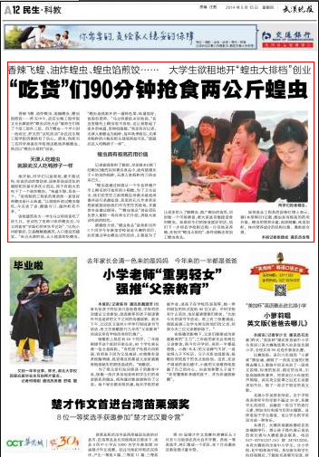据谢晗介绍,“蝗虫食品”是他和另外3个同学今年参加学校创业大赛的项目,此次通过举办蝗虫试吃活动,主要是为了让更多的人了解蝗虫,推广蝗虫的食用,同时做一个市场调查,看大家是否能接受食用蝗虫。如果师生们的接受度好的话,他们下一步将在学校附近租一片田地来养殖,在校开“蝗虫大排档”,条件成熟还将加工蝗虫食品。