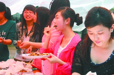 该校建筑系大一学生马立明则连吃了好几只。在试吃了各种口味的蝗虫后,马立明直夸“学姐们的烹饪手艺好”,“比吃小河虾要好,它是酥酥脆脆的,入口即没的感觉。”来自天津的他,从小就喜欢吃蝗虫。“蝗虫是我家乡的一道特色菜,味道很好,也很有营养。”马立明意犹未尽地说,“在这里能吃上蝗虫很不容易,这让我想起了家乡的味道,觉得很温暖。”他还告诉记者,天津人称蝗虫为蚂蚱,每年秋季前后,天津卖蚂蚱的小贩在街头巷尾到处可见,“就跟武汉人吃鸭脖子一样”。