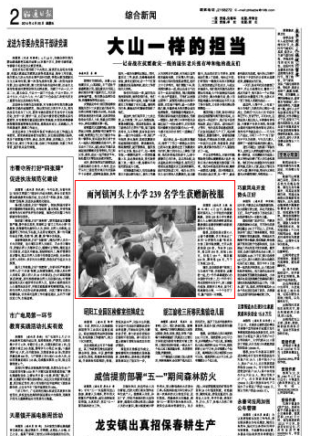 本报讯(通讯员 王毅 赵毅 文/图) 4月22日,镇雄县雨河镇河头上小学校园内暖意融融,该校239名小学生喜获爱心人士委托团县委和迷彩志愿救援队志愿者捐赠的崭新校服和学习用品。