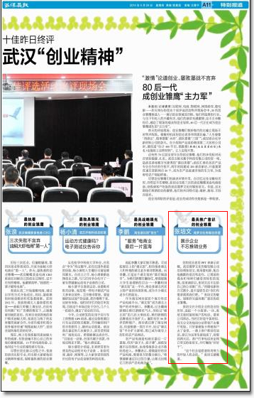别的创业者用PPT来演示讲稿,武汉微梦文化传媒有限公司总经理张培文,则用微电影,配合他幽默的语言和动作,让现场的观众和导师们感受到轻松的氛围。结束演讲后,张培文还不忘给自己的公司做广告,“用微电影的方式推介,是不是更生动?你们有需求就找我们吧。”张培文的敬业,堪称昨天最具推广意识的创业雏鹰。