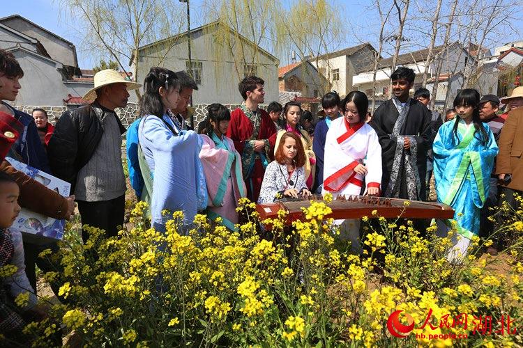 花朝节上,几名来自武汉生物工程学院的外教,和学院汉服社的学生一起,秀汉服,学古筝,上演汉服秀,令游人称奇。