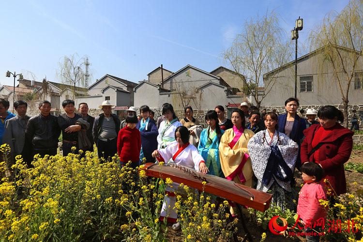 来自武汉生物工程学院的十多名大学生,身着汉服,举行“汉服秀”,他们在现场演示、讲解汉家礼仪,“汉家女”毛航蔚弹奏古筝,声音悠扬动听。这样一幅“汉家文化”图景,吸引众多游客观赏。许多游人还纷纷和汉服女孩合影。