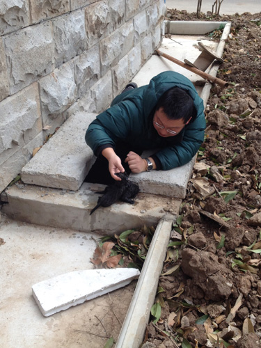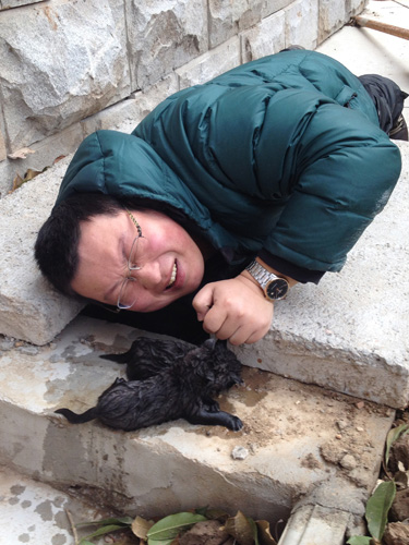 笔者了解到,该名男子叫邓桉树,是武汉生物工程学院建筑系的一名辅导员,学生们都亲切地称呼他“大树”。前不久,邓桉树走到一栋居民楼下时,听到一只黑猫凄厉地叫着,只见黑猫绕着下水道井盖声嘶力竭地哀号。当邓桉树慢慢走近时,黑猫立即警觉地逃走了。他凑近一看,井盖破裂的下水道内,竟然有一团黑乎乎的东西在蠕动!邓桉树瞬间明白了黑猫哀号的原因,他立即在附近找来木棍等工具,试图把幼猫救上来。一番徒劳无功的折腾后,邓桉树干脆卷起袖子趴在地上,用手去捞,一只、两只、三只,巴掌大小的三只猫咪被一一救起。随行的朋友张燚被邓桉树匍身救猫的一幕感动,拿起手机拍下这有爱的瞬间。