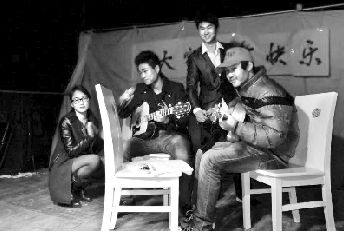 除夕夜,大学生在舞台上表演吉他弹唱。