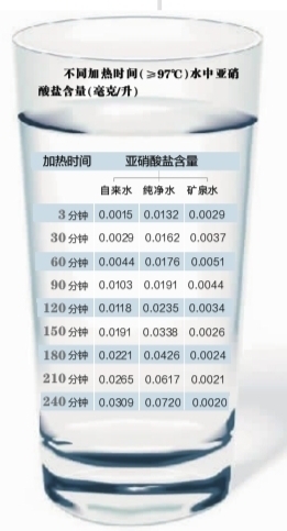 根据GB 8537- 2008对饮用水中亚硝酸盐的限量要求为0.1毫克/升,在实验的加热时间内三种水质都没有超过国家标准对亚硝酸盐的限量要求。反复煮开会让水中的亚硝酸盐水平轻微升高,但只要本来的水质达标,这样做并不会让其中的亚硝酸盐水平超标。