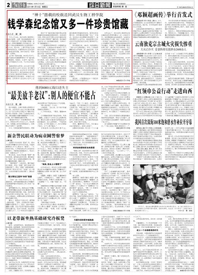 “大家可能并不知道武生院的发展与我父亲的两封信密不可分。一直埋头为国防科技事业奋斗的钱学森直到晚年才慢慢出现在公众的视野。当时有很多著名高等学府曾致信给他,就学校的发展方向、学科建设等问题‘问计’于钱老。但这些大学发展都非常成熟了,钱老觉得没什么话可说,唯独觉得对当时还名不见经传的武汉生物工程学院可以说几句话。”