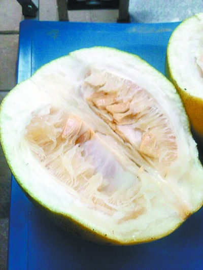 【本报记者王震 核实】昨天下午,记者在该小区大门前的步行街上,看见左右两边各有十几棵柚子树,枝头硕果累累。小区保安赵师傅帮记者摘了一个。记者剥皮时发现皮很厚,果肉很少,尝一口感觉又酸又涩(见图)。武汉生物工程学院园林系博士丁健说,这种柚子树是专门的景观品种,不是水果柚子树。