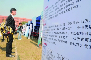 其中,中国船舶重工集团公司承诺聘用的博士研究生一次性安家费15万元,而且在其办理报到入职手续后,公司为其提供住房一套。不过,该公司标明应聘条件是“国家统招的一类重点院校相关对口专业”等。而武汉生物工程学院承诺给博士开出8万~15万元的年薪,另外提供10万元以上的安家费,同时免费提供130~180平方米的精装修住房一套,而且其配偶若是本科以上学历,“身体健康者可安排来校工作。”