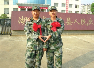 嘉鱼县的雷文星、雷武星兄弟俩,是一对双胞胎,今年双双从嘉鱼县一中毕业,都考取了武汉生物工程学院。面对祖国的召唤,兄弟俩毅然选择投笔从戎,双双报名参军,经过层层选拔,又一同实现了从军梦。图为兄弟俩踏上征程前在县人武部合影留念,手势表示兄弟俩一“心”报国。
