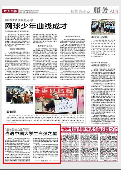 今年3月,本报独家率先报道了程菲的感人事迹,引起了强烈的社会反响。4月,该校召开程菲事迹研讨会,湖北省道德模范汪金权赞誉她是“中国传统孝德文化”的传承者,用自己柔弱的肩膀撑起整个家庭的重担;远在江苏出差的全国道德模范吴天祥也专程发来信件:程菲身上的孝道、坚韧和感恩让人感动,青少年可把她当做雷锋精神在当下最可学习的代表。