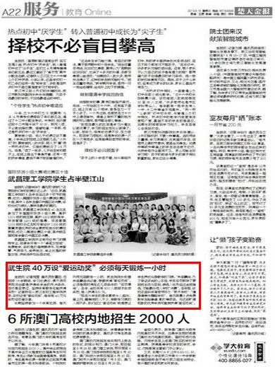 楚天金报讯 金报讯(记者梅莹 通讯员张重阳、任丽琼)大学期间,学习成绩好、课外活动表现突出都是获得奖学金的先决条件,但你是否想过,坚持体育锻炼也能获得奖励?记者昨日从武汉生物工程学院获悉,该校设有“爱运动奖”,每年用40万元奖励运动爱好者。