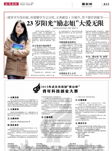 记者杨佳峰 通讯员张重阳 任丽琼 摄影李子云 一度休学为母治病,再度辍学为父分忧,义务献血1万毫升,签下器官捐献书……6年来,23岁的武汉生物工程学院化学与环境工程系2010级女生程菲,走过了一条常人难以想象的艰辛路,但困难波折阻拦不了她的前进脚步。外表阳光灿烂的她,将无限大爱埋在心底,被师生称为最低调的“励志姐”。
