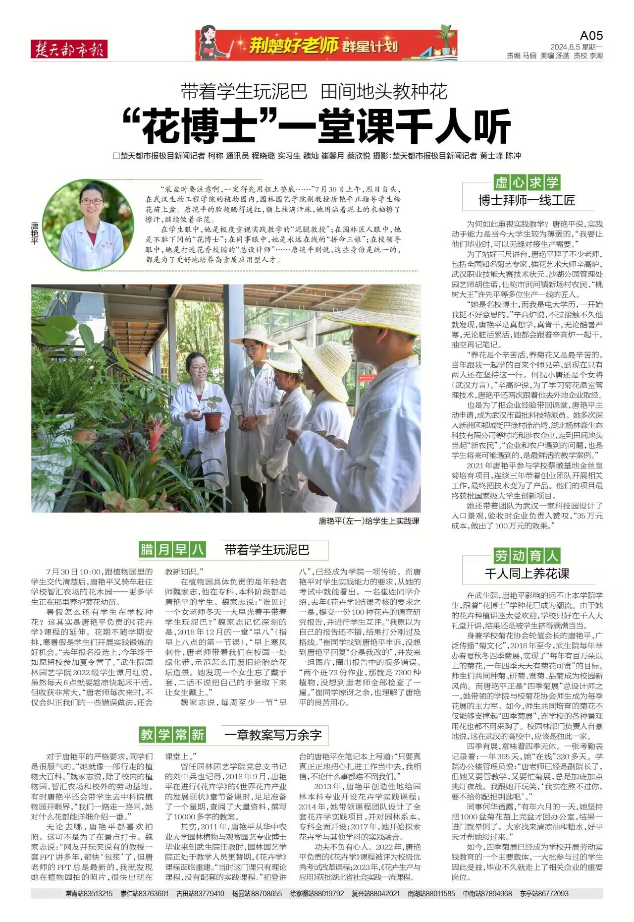 在学生眼中,她是极度重视实践教学的“泥腿教授”;在园林匠人眼中,她是不耻下问的“花博士”;在同事眼中,她是永远在线的“拼命三娘”;在校领导眼中,她是打造花香校园的“总设计师”……唐艳平则说,这些身份是统一的,都是为了更好地培养高素质应用型人才。