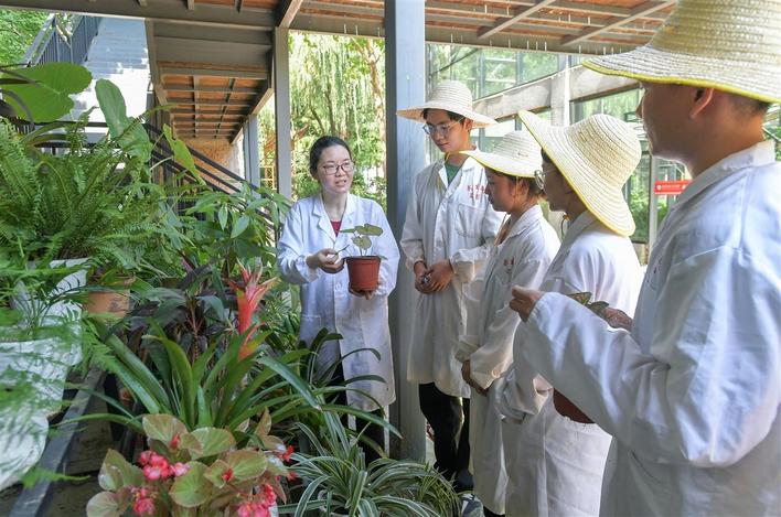 暑假怎么还有学生在学校种花?这其实是唐艳平负责的《花卉学》课程的延伸。花期不随学期安排,寒暑假是学生们开展实践锻炼的好机会。“去年报名没选上,今年终于如愿留校参加夏令营了。”武生院园林园艺学院2022级学生谭月红说,虽然每天6点就要趁凉快起床干活,但收获非常大,“唐老师每次来时,不仅会纠正我们的一些错误做法,还会教新知识。”