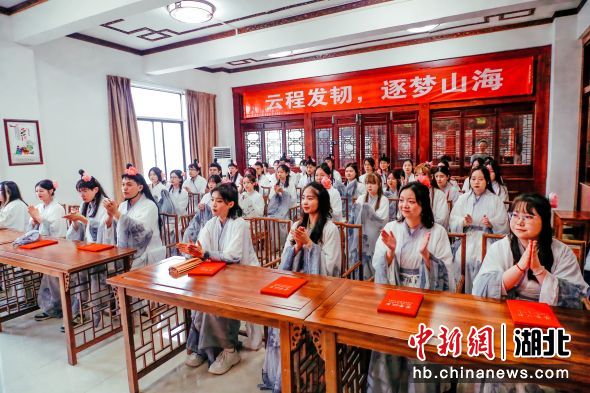 中新网湖北新闻6月20日电 (程晓璐 周晚霞)一年一度的毕业季如约而至,为给毕业生们的求学之旅画上一个圆满的句号,6月18日,在学校集体毕业典礼之后,武汉生物工程学院文学院举办了一场特别的毕业纪念活动。在该校国学馆,61名文化产业管理专业毕业生身穿汉服,“正冠”“饮露”“簪花”“谢师”,让众毕业生身临其境体验古代进士才有的待遇。