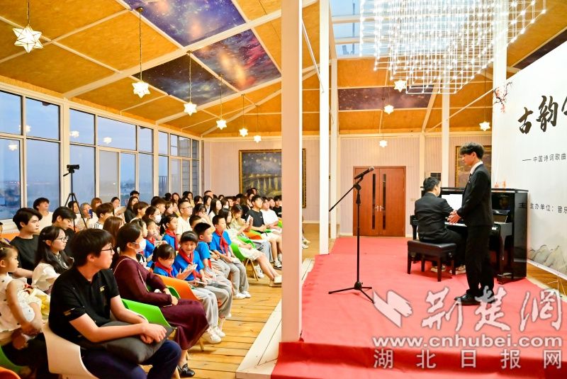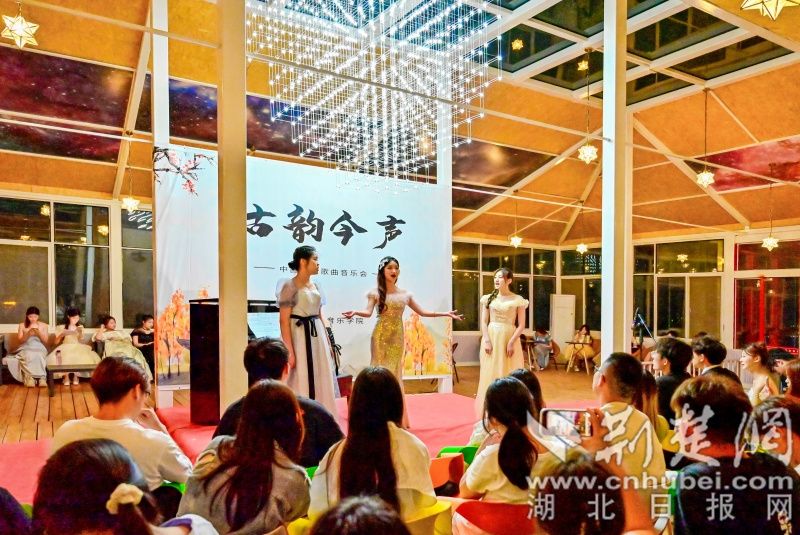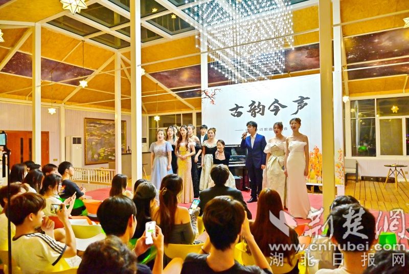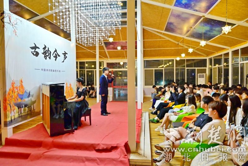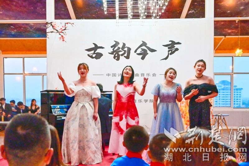 荆楚网(湖北日报网)讯(通讯员 程晓璐 摄影 陈冲)“敕勒川,阴山下。天似穹庐,笼盖四野。天苍苍,野茫茫,风吹草低见牛羊……”一曲蒙古长调缓缓而起,6月14日晚,“古韵今声”中国诗词歌曲音乐会在武汉生物工程学院星空音乐厅拉开帷幕,该校音乐学院教师胡琳媛带领音乐教育专业学生,时而浅唱,时而高歌,全场观众沉浸在“和诗以歌”的世界里。