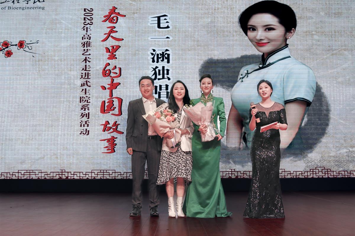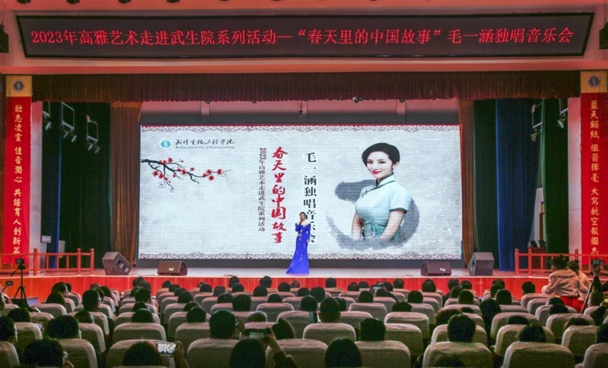 毛一涵是花腔女高音歌唱家,也是武汉生物工程学院“高雅艺术——校园传播活动”客座教授。当天,毛一涵演唱了《小河淌水》《芦花》《春风圆舞曲》《新时代进行曲》《雪花请柬》等多首歌曲,向该校师生展现了中国声乐的民族性及多样性。