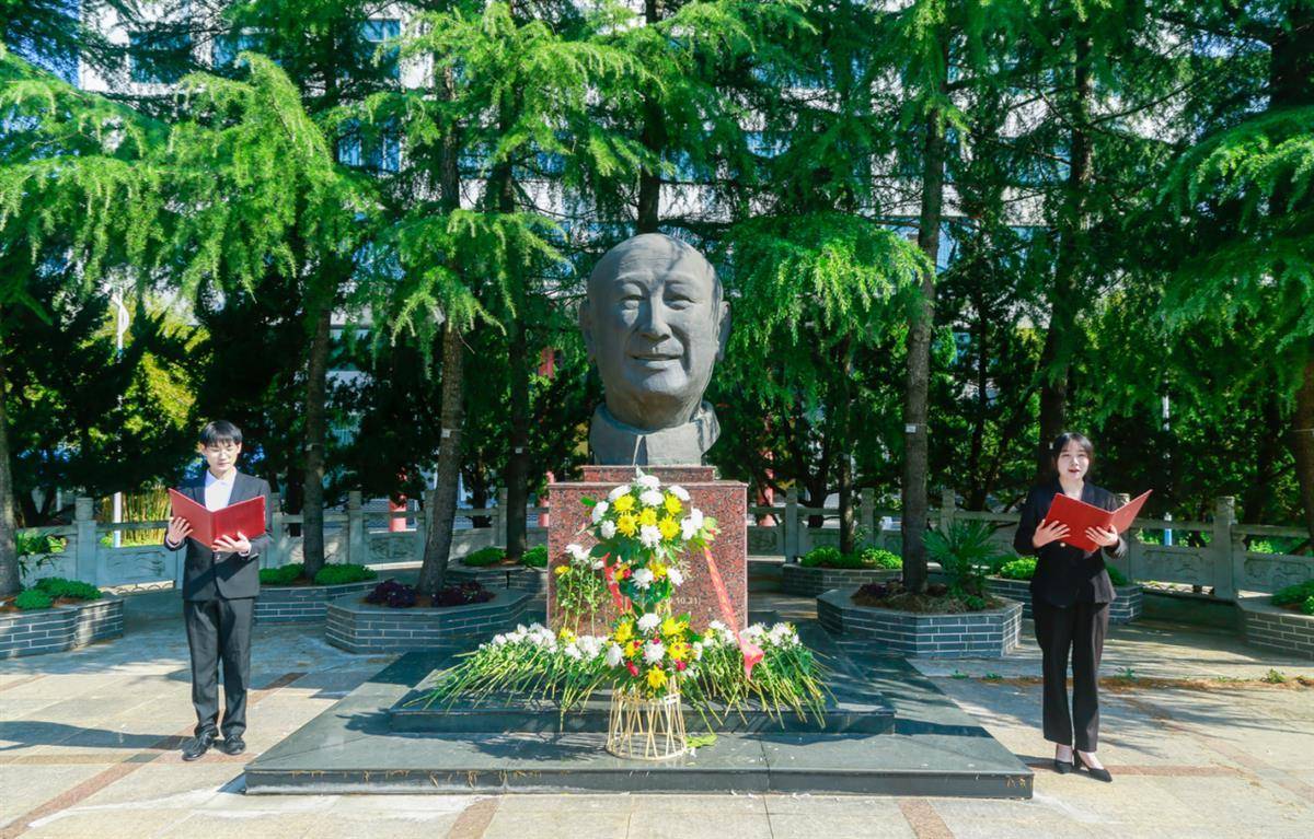全体师生统一身着深色服装,肃立于苍松翠柏掩映下的钱学森广场,向钱学森铜像默哀一分钟。校党委书记江珩、副校长董妍玲向钱学森铜像敬献花篮,红色缎带上书写着“深切缅怀人民科学家钱学森”,寄托了全校师生对钱老的崇高敬意。全体师生向钱老铜像鞠躬致敬,并依次上前敬献鲜花并绕铜像一周,瞻仰铜像,缅怀钱老。