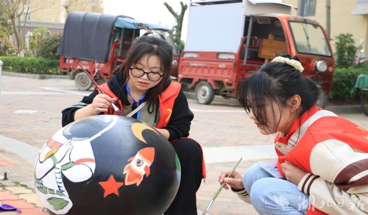 来自艺术学院的志愿者们在社区广场上彩绘航天图案