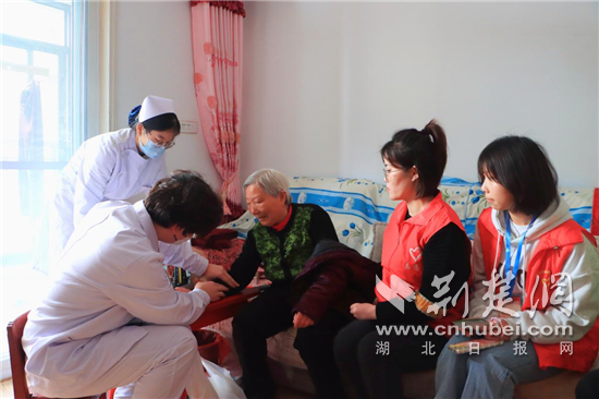 武汉生物工程学院志愿者为“空巢老人”测量血压。通讯员供图
