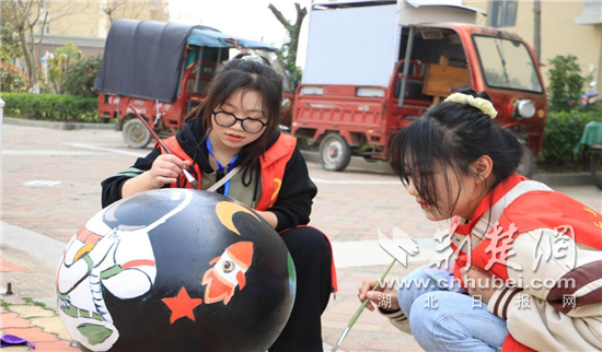 来自艺术学院的志愿者们在社区广场上彩绘航天图案。通讯员供图