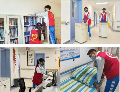 身着红马甲的武汉生物工程学院志愿服务队成为了医院里一道亮丽的风景线