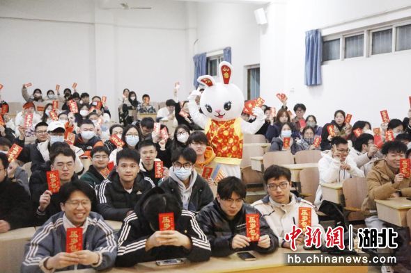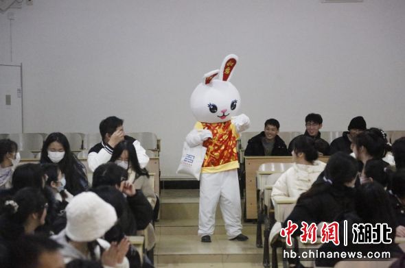 中新网湖北新闻2月14日电 (龚文翰 游宏远)2月12日晚,武汉生物工程学院医药学院开学前第一次班会上传来欢声笑语,该校辅导员肖亚慧装扮成兔年玩偶,为班级同学们送上新年祝福,派发新年礼物。