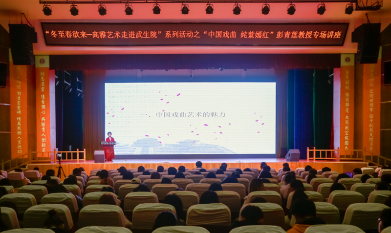 荆楚网(湖北日报网)讯 (通讯员 程晓璐 田野 谈宇锋)为弘扬民族文化,展现国粹经典,营造校园艺术氛围,提升师生审美素养。12月20日下午,“冬至春欲来——高雅艺术走进武生院”系列美育活动首场“中国戏曲姹紫嫣红”专场讲座在武汉生物工程学院问天湖畔大礼堂浓情启幕。活动邀请了著名楚剧表演艺术家、楚剧非遗传承人彭青莲,带来了一场中国戏曲文化盛宴,让师生们近距离感受国粹的韵味和魅力。