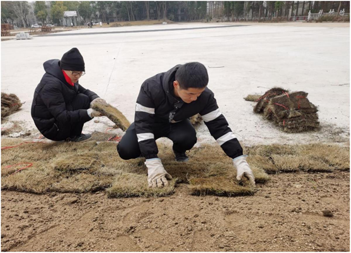 罗中华在阳光广场铺草坪
