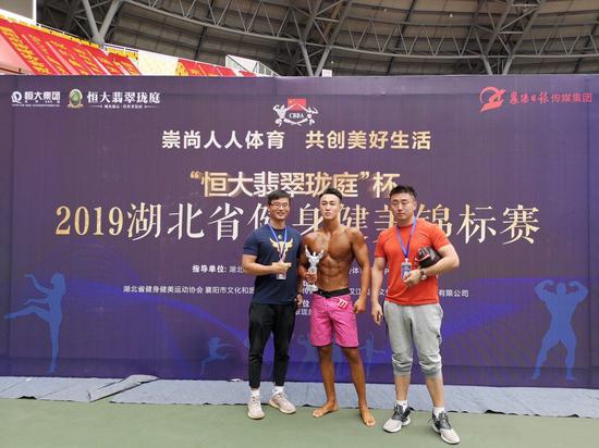 图为陈子威(中)参加2019湖北省健身健美锦标赛获奖留念