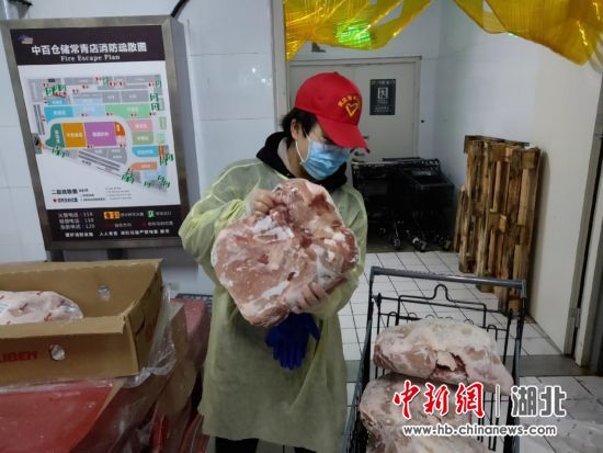 肖洁丽正在拆包国家投放的储备冻猪肉