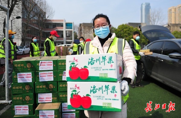 长江日报-长江网记者见到陶梦婷时,她刚刚和其他志愿者们一起将二十多箱苹果从货车上卸下。这批陕西援助的爱心物资包括整箱的水果、饮料、肉夹馍等食品,每箱重约20~30斤不等,需要陶梦婷这批志愿者整齐地码放在操场上,再逐一搬上相应车辆,送往医院、社区等指定地点。