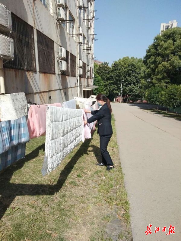 同样在今天,武昌理工学院东三栋宿管员张曰琴、西五栋宿管员周红等忙碌着帮学生晾晒衣被,“学校靠湖,比较潮湿,衣被长期不晒容易发霉,这都是我们应该做的!”