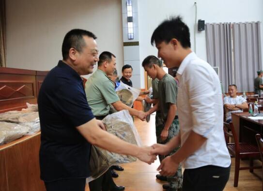 党委书记赵正洲(左)等校、地领导为入伍大学生颁发纪念品。