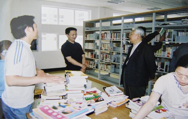 沈老非常关心学校图书馆建设,20世纪90年代,他向学校图书馆捐赠自己收藏的图书675本。图为2004年图书馆新馆建成后,他到该馆指导工作,并亲自为新馆题写馆名。