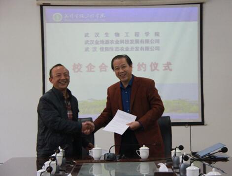 李友清校长(右)与武汉市金地源农业科技发展有限公司霍刚在接待中心西湖厅签订合作协议