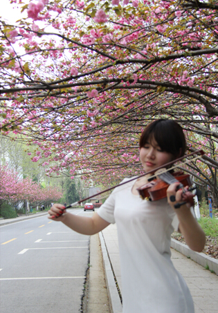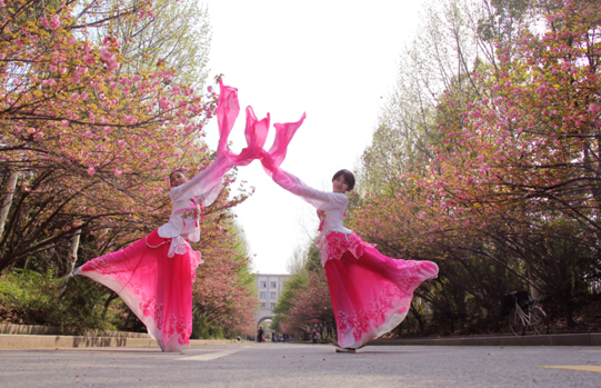 学校300米的樱花大道上种植了150余株日本晚樱。为了达到错落有致的园林观赏效果,在种植时采取丁字形排植和间植的方法,将樱花大道两侧分别错落种植两排晚樱树和一排高大乔木法桐树。樱花花期时叶片并不发达,法桐的新绿恰到好处地衬托樱花的娇美,而樱花大道尽头欧式风格的教学楼让画面的景色更加丰满。正是人间四月天,晚樱独艳。师生们快来赏樱吧!