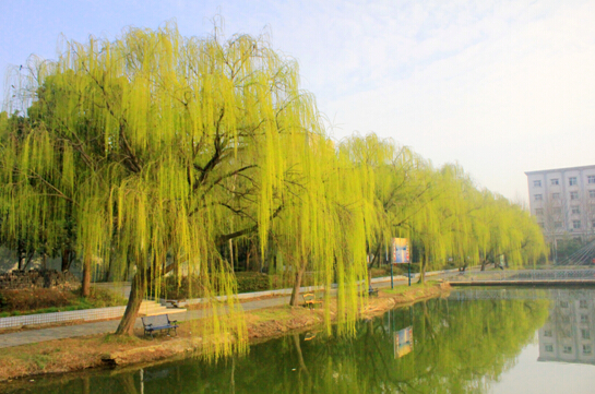 位于风华大道旁的问天湖,形如一把开启智慧的钥匙。湖边成排的垂柳,柳影摇曳,临风起舞,婀娜多姿,在蓝天湖水的陪衬下显得异样锦绣。