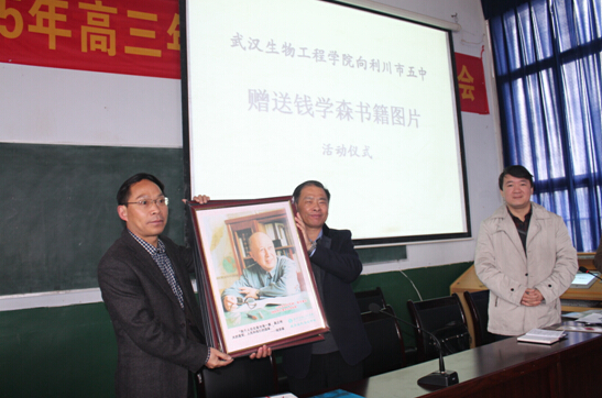 学校党委副书记李斌成代表学校向利川五中赠送钱学森书籍与图片