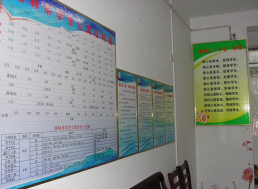进入学子A北公寓,首先映入眼帘的是园林系学生党员责任岗,其岗位职责包括协助参与公寓值班、公寓巡查,排查隐患,协助辅导员、公寓管理员处理突发事件等十多项内容。位于该学生公寓一楼的园林系辅导员办公室,室内干净整洁,墙上张贴有社会主义核心价值观内容,入党誓词,大学生心理健康标准,园林系学生公寓结构图,党总支负责人和辅导员工作岗位职责,公寓值班职责,辅导员“十心”管理等制度。据介绍,该办公室同时也是园林系的心理辅导室和党员宣誓中心,园林系党总支负责人和辅导员平时都会轮流在此值班巡查,及时解决同学们的困惑和问题。