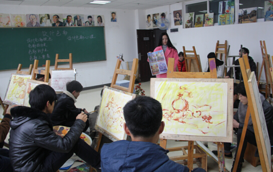 《设计色彩》课上,盛天娇老师深入学生,分析一幅图四种色彩,讲解色彩效果的重要性。