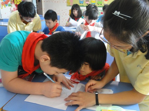 微爱团队成员与孩子们一起绘画