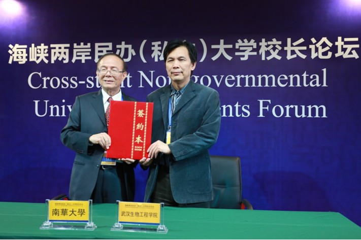 武汉生物工程学院理事长余毅出席论坛期间,与台湾大叶大学、朝阳科技大学等多所台湾高校负责人就定期开展师生互访、学术交流等事项达成合作意向。上图为余毅理事长与南华大学林聪明校长就武汉生物工程学院与南华大学开展学术交流合作事项在长春正式签约。