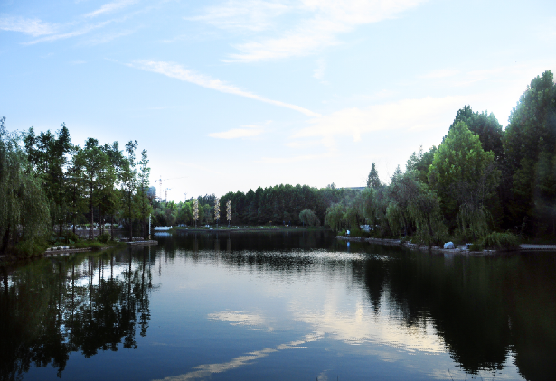 映衬在蓝天白云下的晨光湖