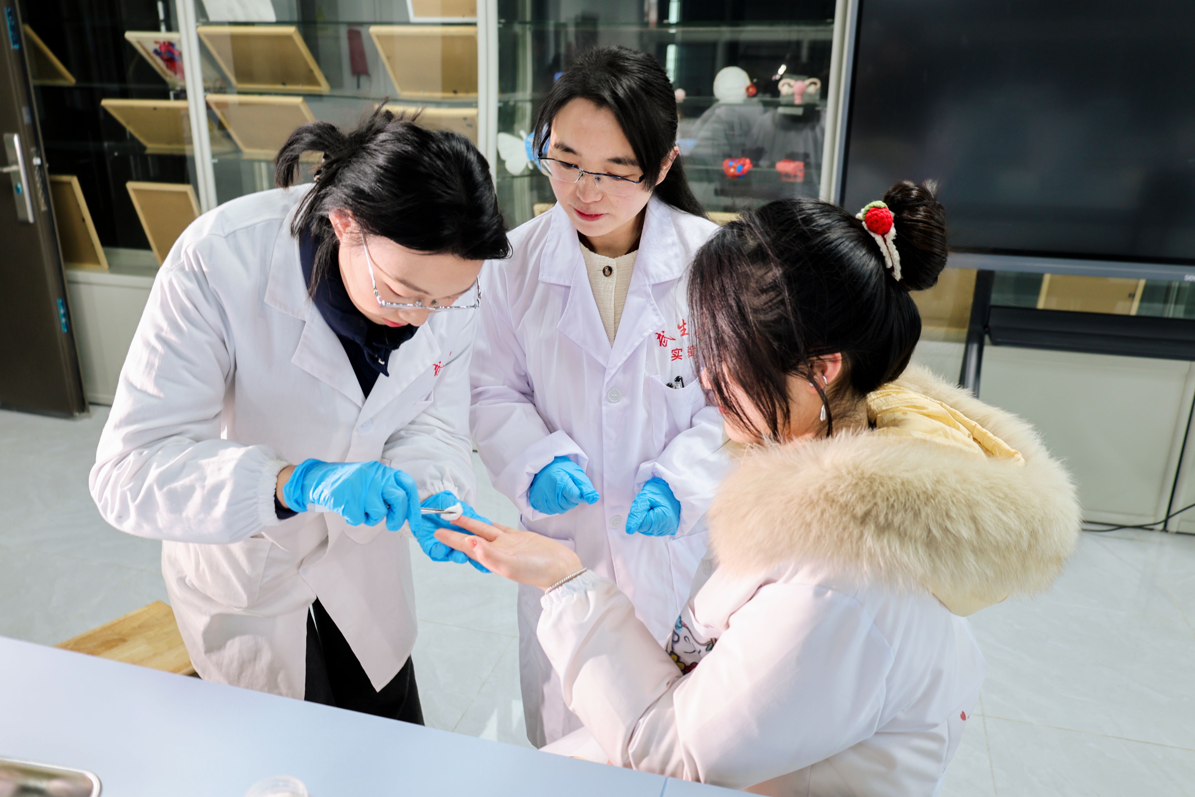 徐明(中)正在指导学生操作指尖采血