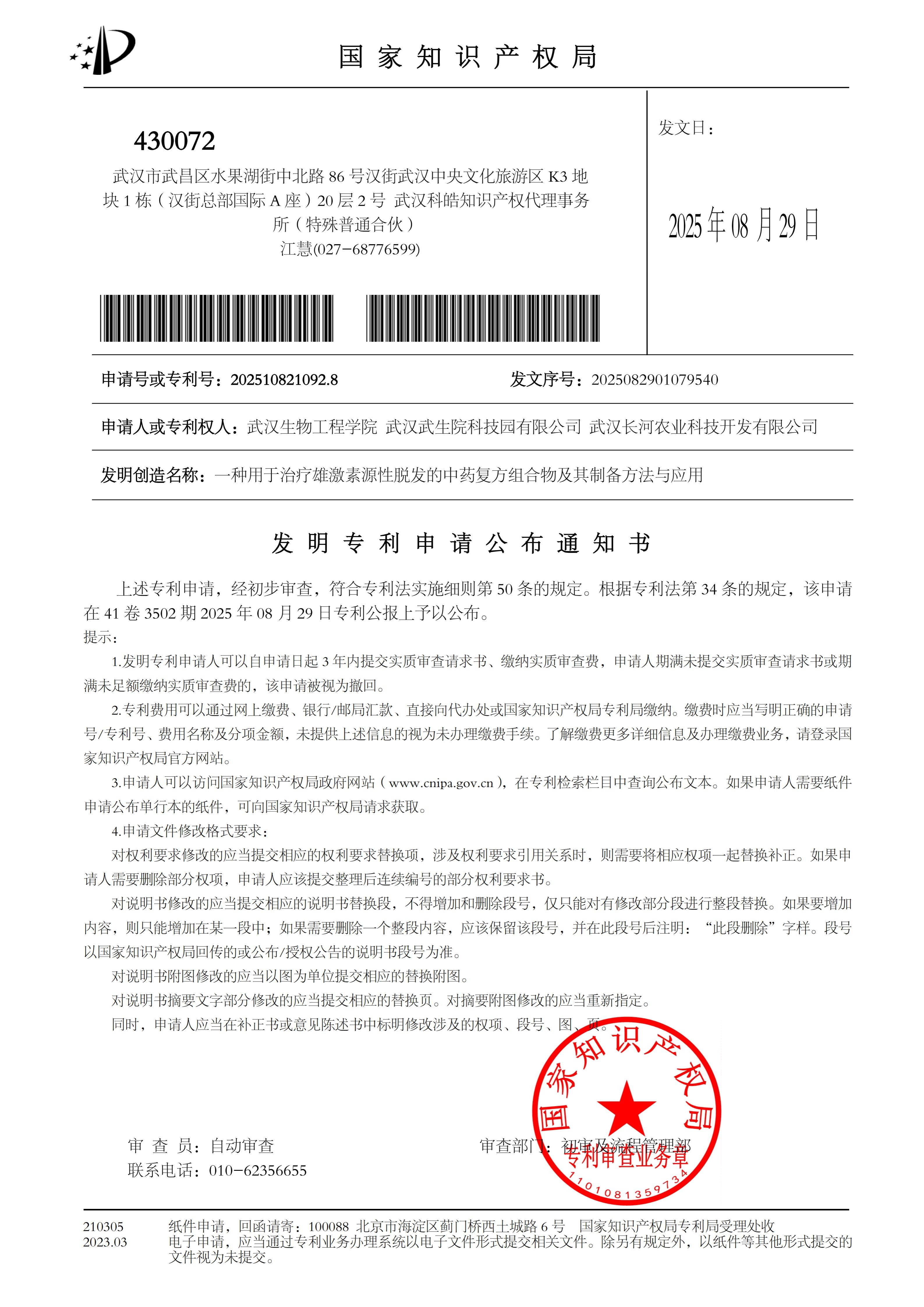 聂丽和学生的专利申请公布通知书截图