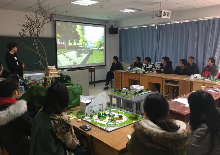 王洋老师邀请了我校园林系段然老师、建筑工程学院胡长威和赵雄辉老师等专业教师,一起评估学生的期末作业。先由每个小组对合作完成的模型进行介绍和设计说明,再播放学生自己制作的视频来加深对模型的立体效果图展现,然后四位老师对学生的作品进行点评。