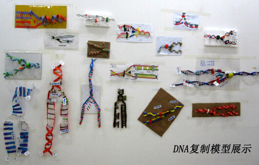 2013级生物技术专业2班学生彭忆平说:“自己亲自动手去做一个模型,和只是看书本上的知识,是完全不一样的。我以前一直觉得DNA复制只需要DNA聚合酶,真正去查相关资料时,才发现原来DNA复制有很多酶的参与。从查找资料到最后出作品,我和4个小伙伴共花了5个多小时。”