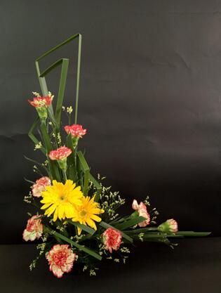 L型插花(花材:康乃馨、非洲菊、香蒲叶、水晶草)